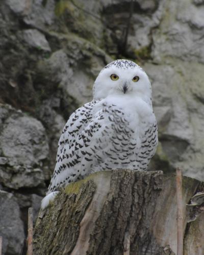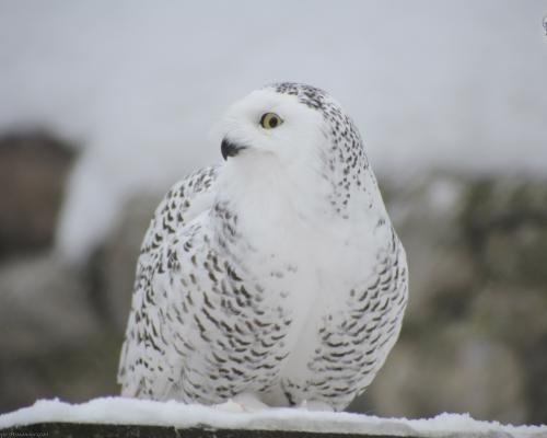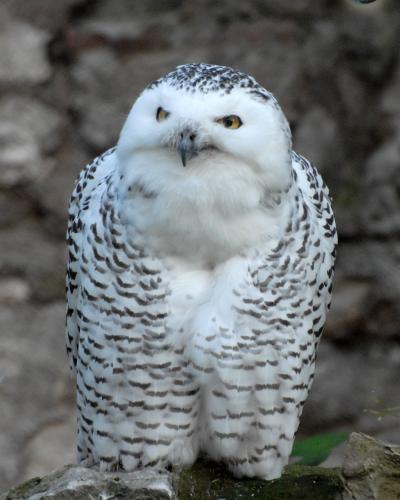 These are big quiet birds. The owls are very beautiful. Their feathering is white with brown spots but sometimes they happen to be completely white. Their eyes are bright yellow, the beak and the claws being black.