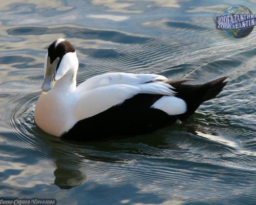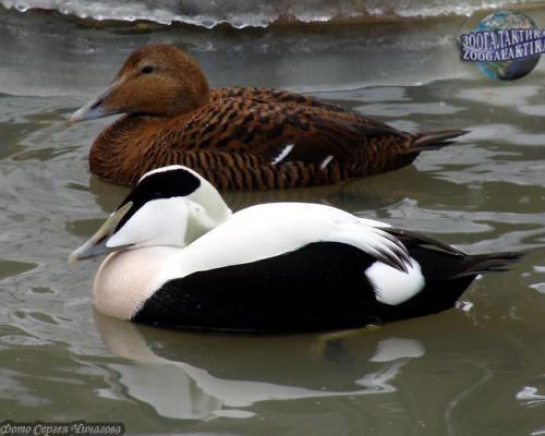 An eider is a sea duck. An eider lives in the North. The eider females are not very beautiful, being brownish-gray, while the eider male is a real dandy in spring. An eider male can be recognized by a black hat on the head, black flanks and tail, an orange-pink breast and green spots on the nape. The eider's belly is black and the breast is white.