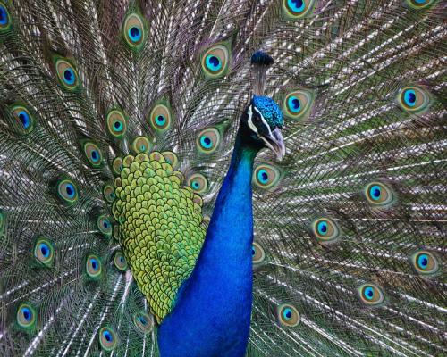 A peacock has a remarkable colorful feathering and a splendid long tail with iridescent spots looking like eyes. Raising up the tail and exposing it as a fan, a peacock male majestically walks about on the ground. A peacock female has no a beautiful tail or brilliant feathers. She cannot attract any attention of predators since she must be unnoticeable when she is sitting on her nest and hatching her eggs.