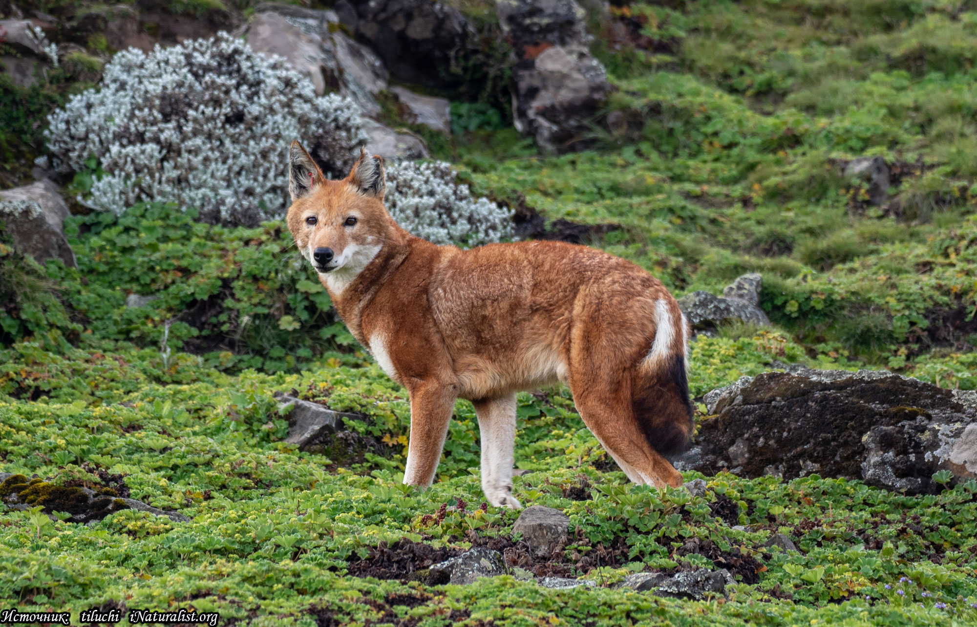 Canis simensis is a long-legged, long-nosed wolf; its appearance is more or less typical of the canid family; it is dark reddish in colour, with a light (often white) throat, chest and lower part of the limbs, and some individuals have light patches on other parts of the body; the back of the ears and the upper part of the tail are black. Males weigh an average of 16 kg and females 13 kg. Shoulder height is about 60 cm.