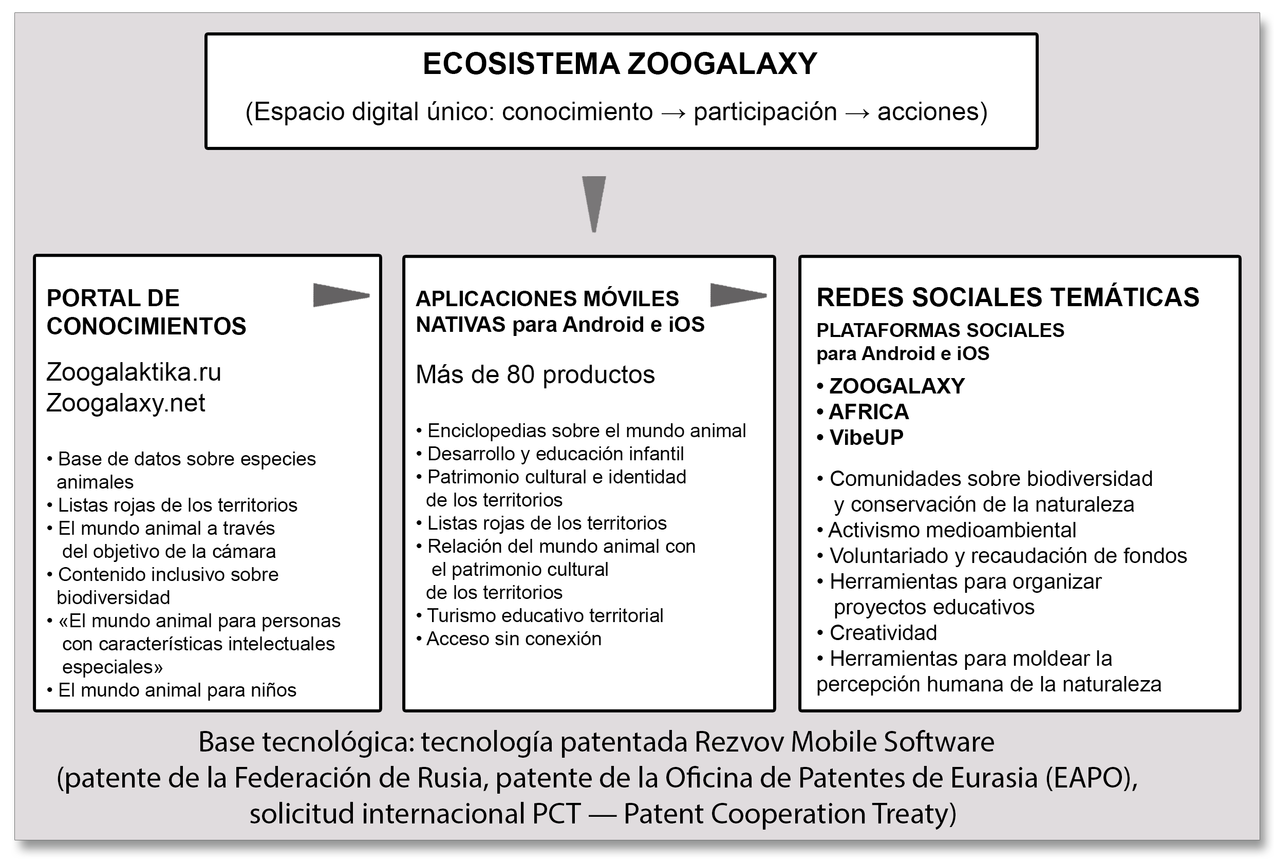 La tecnología patentada de Rezvov Mobile Software se convirtió en la base que permitió pasar de la idea de la educación ecológica a su implementación práctica masiva en forma del ecosistema ZOOGALAXY y las redes sociales móviles temáticas relacionadas con él.