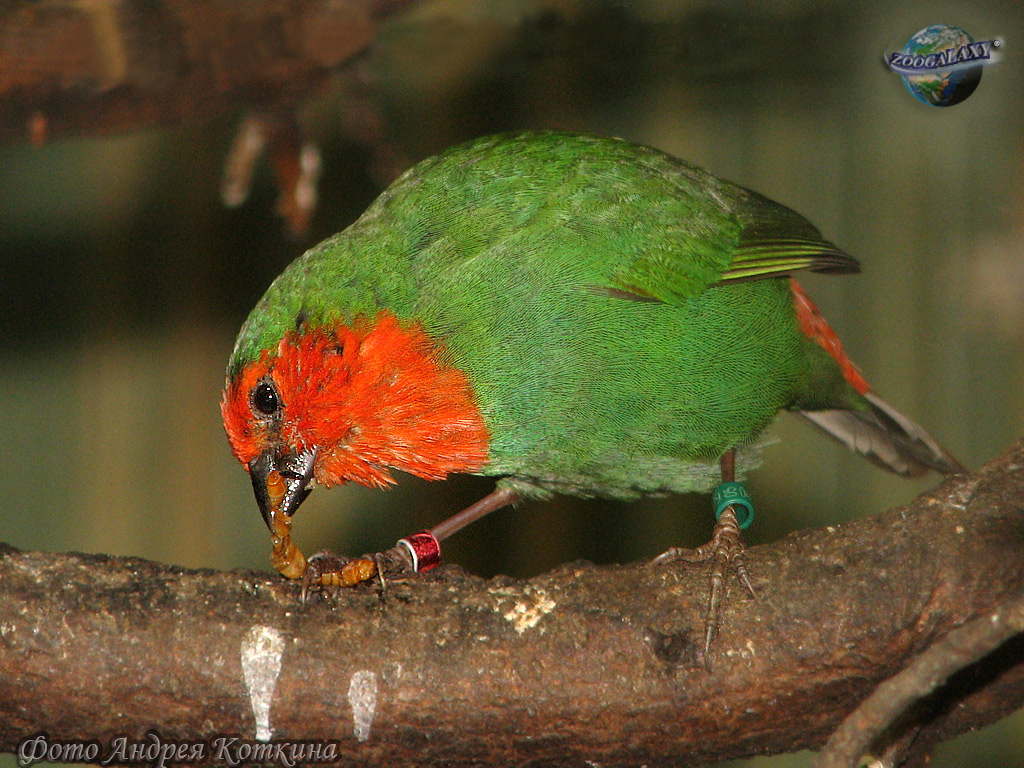 Longitud del cuerpo 12 cm. El plumaje es de color verde oscuro. La cara y la parte superior del tórax son rojas. El dimorfismo sexual está ausente. Muchos machos tienen varias plumas rojas en el abdomen.
