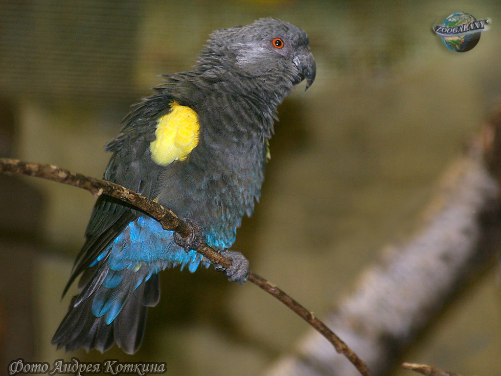 Longitud del cuerpo 22-24 cm, cola 6 cm; peso 121-156 g. La coloración principal del plumaje es gris oliva. La parte inferior del cuerpo tiene un tinte verde azulado. El tórax y las orejas son grises. Hay una gran mancha amarilla en el pliegue del ala, y la parte inferior de las "patas del pantalón" es del mismo color. El pico es negro. Patas grises. El iris es rojo anaranjado. La espalda y la cola de la hembra son azules, la de la hembra es azul claro.